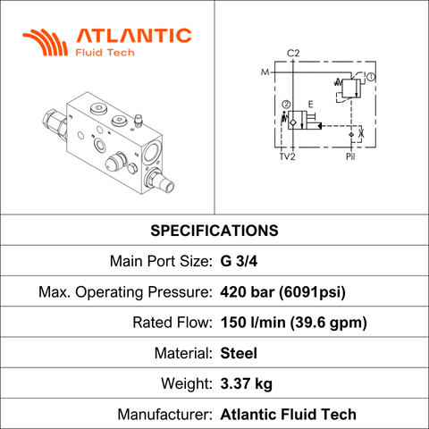 THIS CHECK & METERING VALVE ISO8643 FEATURES G 3/4" × 2 AND G 1/4" × 2 CONNECTIONS WITH A PRESSURE RATING OF 420 BAR AND A FLOW CAPACITY OF 150 LPM. BRAND AFT.