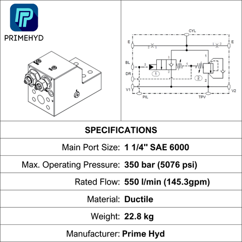THIS CHECK & METERING CARTRIDGE FEATURES G 1/4"-19 × 3 AND G 1/8"-28 × 2 AND 1-1/4" SAE 6000 × 2 CONNECTIONS WITH A PRESSURE RATING OF 550 BAR AND A FLOW CAPACITY OF 350 LPM. BRAND PRIMEHYD.