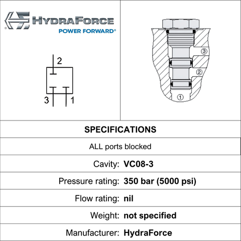THIS CAVITY PLUG 3-WAY BLOCKS ALL PORTS USES A C-8-3 CAVITY AND OPERATES UP TO 350 BAR. BRAND: HYDRAFORCE.