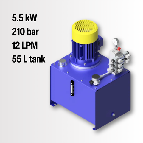 THIS HYDRAULIC POWER UNIT OPERATES WITH 5.5 KW MOTOR AT 415 V AC. DESIGNED FOR 300 BAR AND 8 L/MIN. INCLUDES 55 L TANK AND PMC 30 VALVE INTERFACE. BRAND: PRIMEHYD