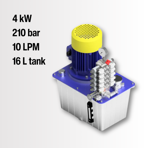 THIS HYDRAULIC POWER UNIT OPERATES WITH 4.0 KW MOTOR AT 415 V AC. DESIGNED FOR 300 BAR AND 5 L/MIN. INCLUDES 16 L TANK AND PMC 30 VALVE INTERFACE. BRAND: PRIMEHYD