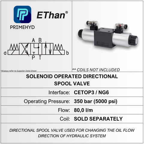 THIS DIRECTIONAL CONTROL VALVE FEATURES A J SPOOL DESIGN, CETOP 03 / NG06 SIZE, A MAXIMUM OPERATING PRESSURE OF 350 BAR, AND A FLOW CAPACITY OF 80 L/MIN. BRAND: HIGH-TECH.